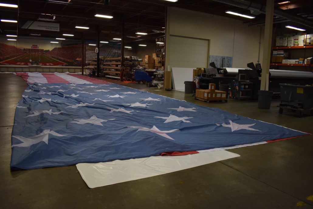 Vision Graphics was selected to produce the flags, each of which required more than 9,000 square feet of fabric. In order to be functional on the field, Vision Graphics helped recommend materials that would allow the flags to billow and move properly on the field. According to Gene Chambers, “We used a special fence fabric, which has perforations. This mesh-style fabric allows the entire flag to breathe a little bit and move up and down without becoming a parachute.”